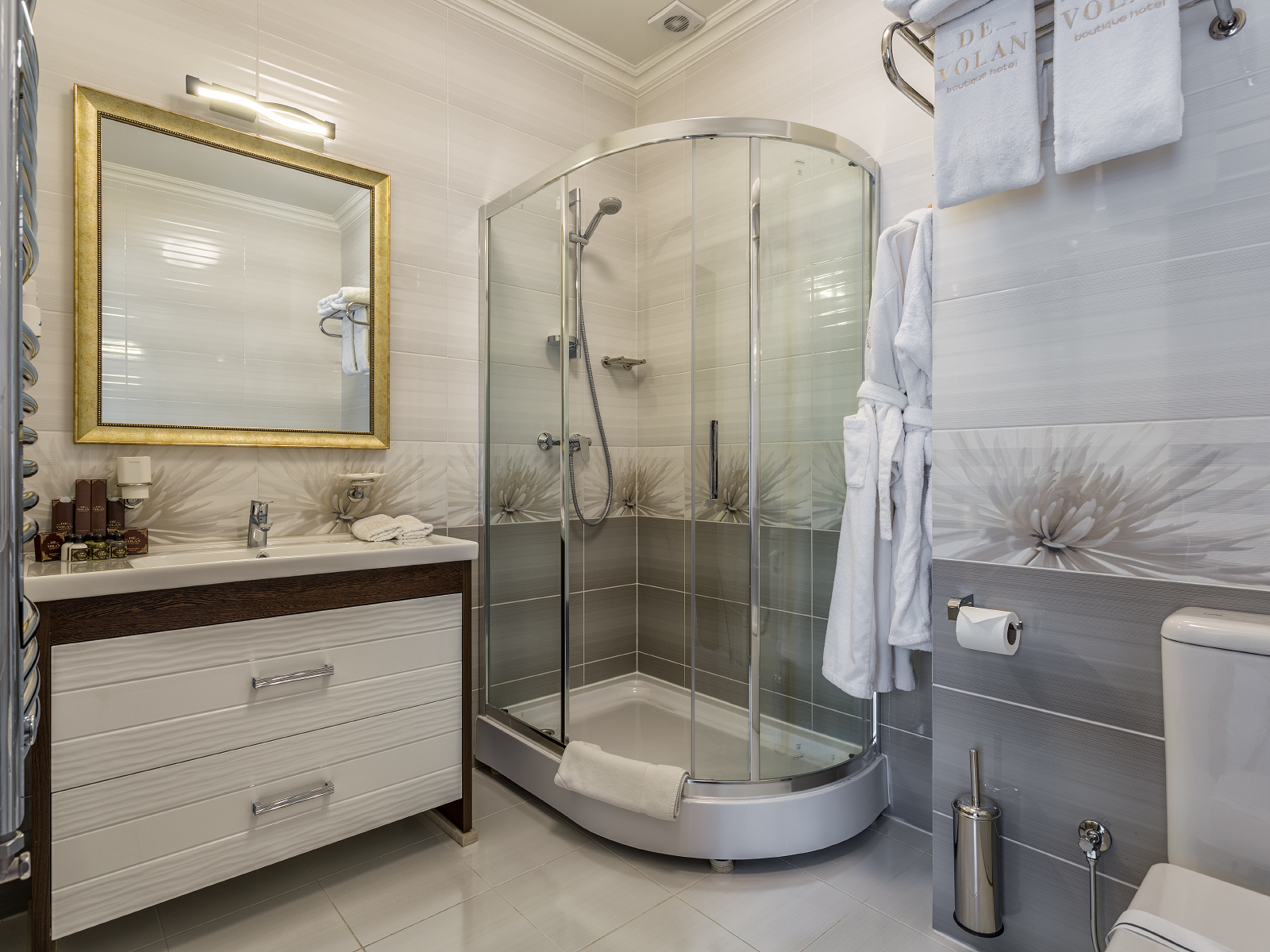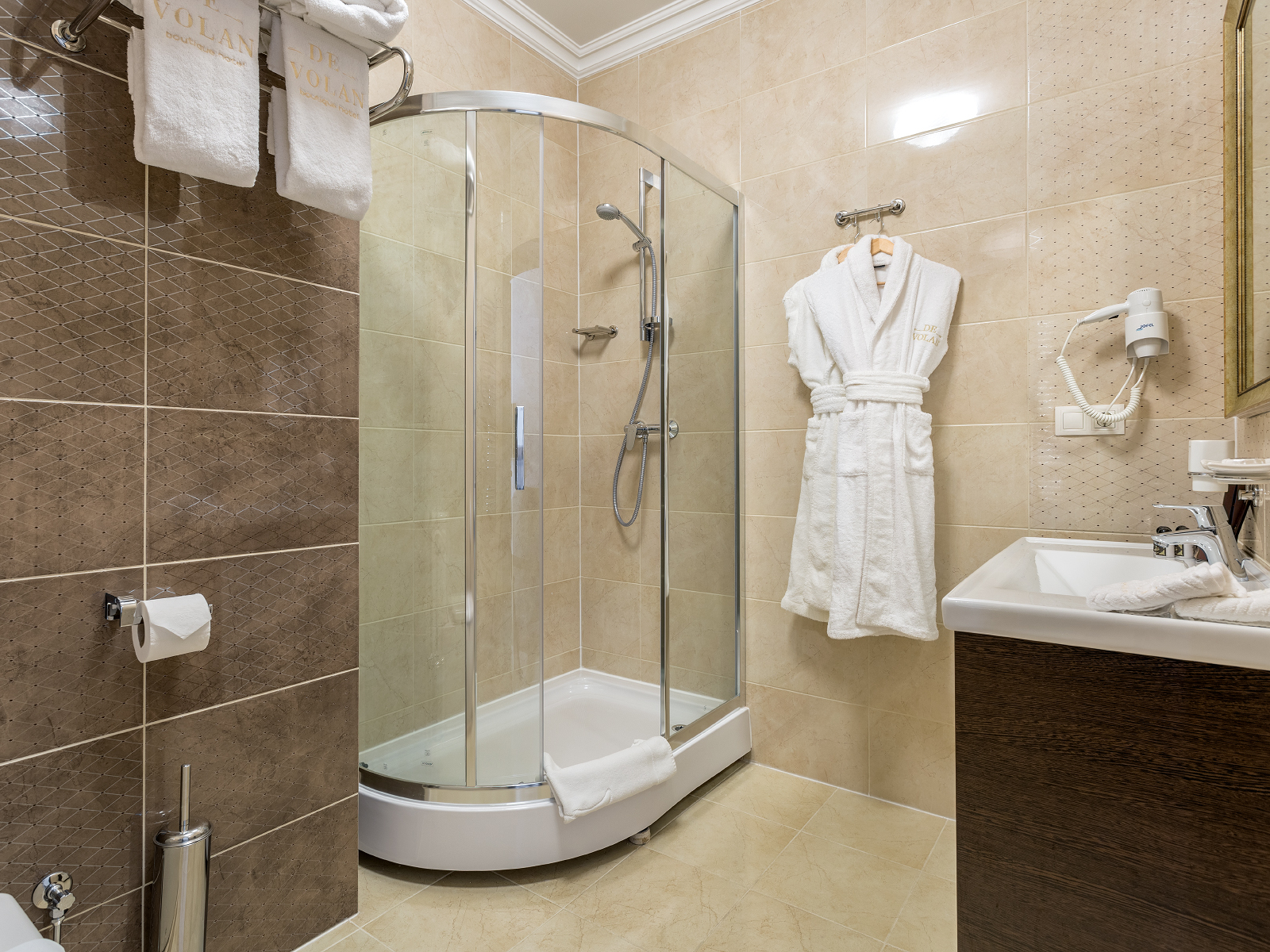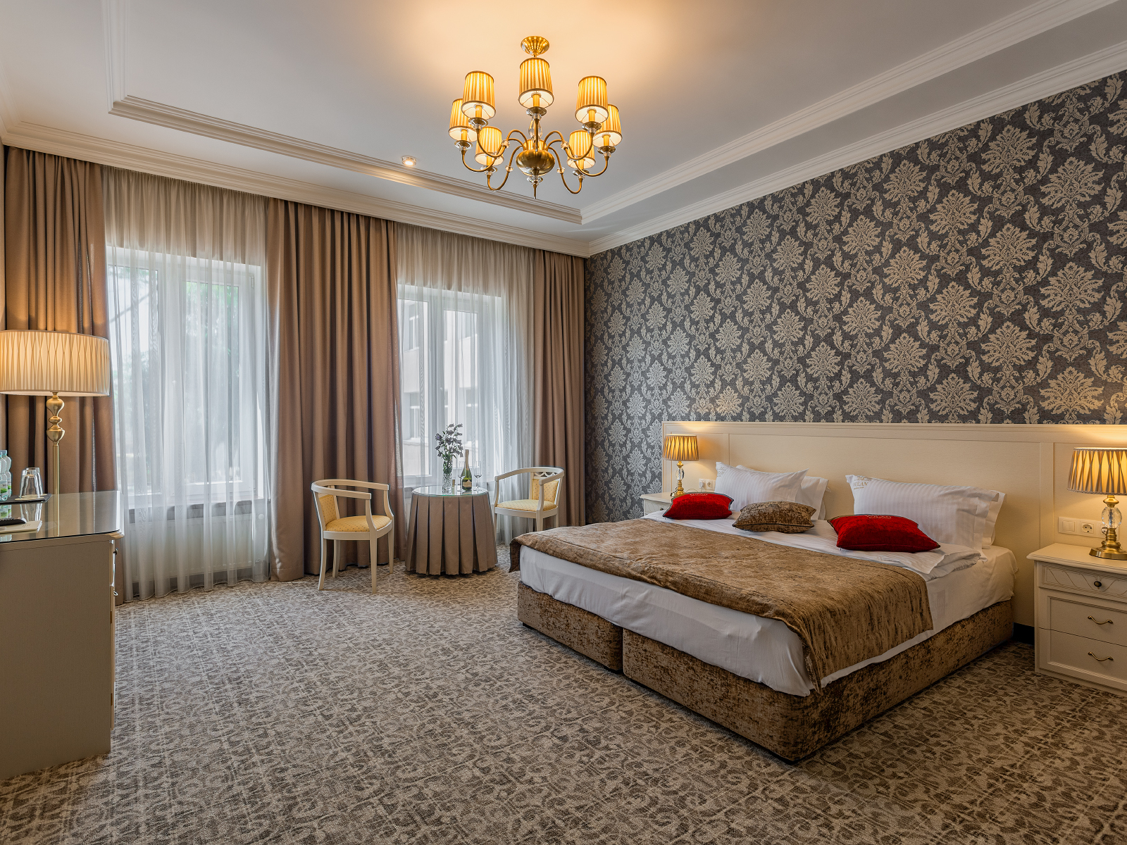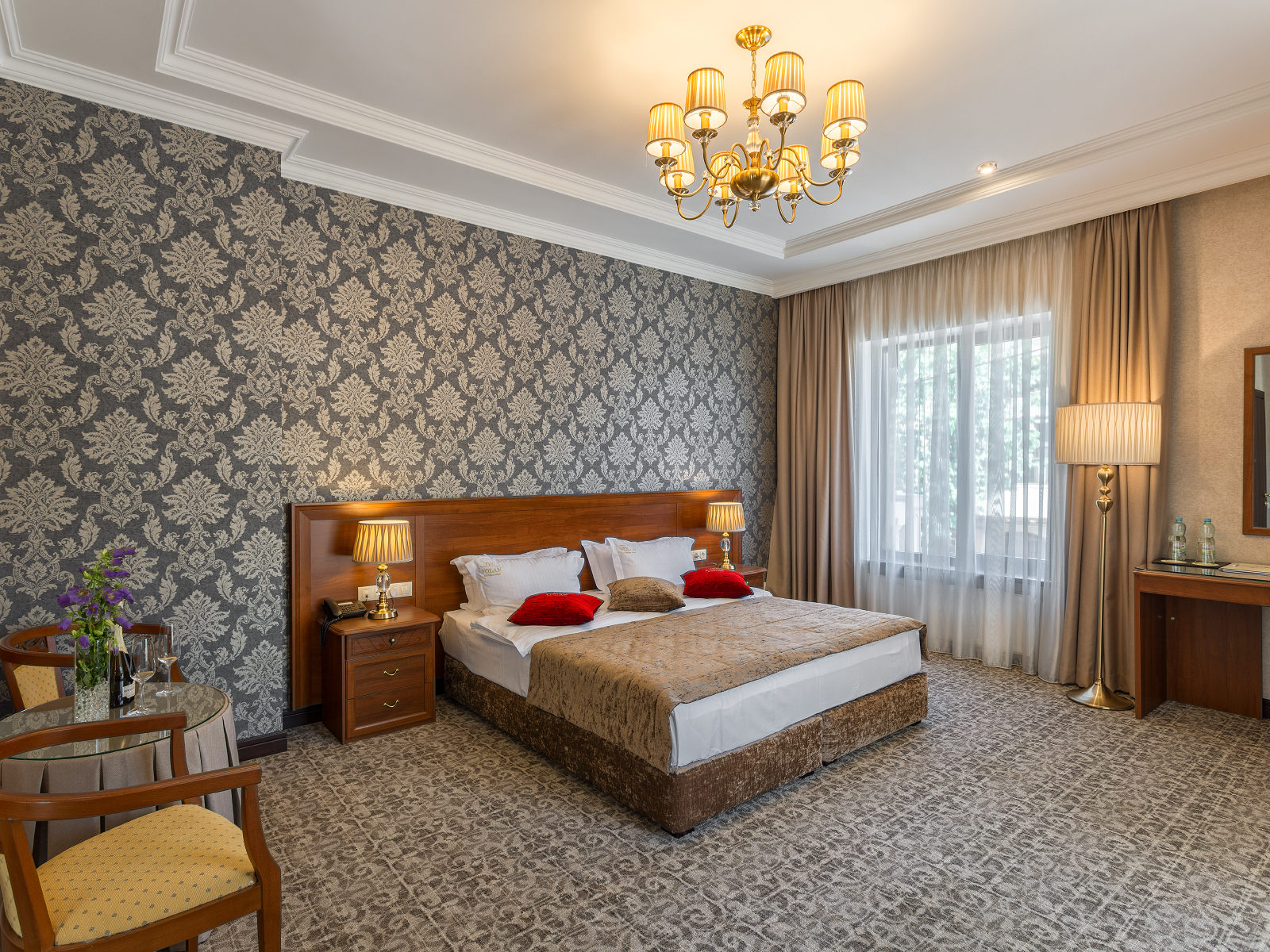 Просторий однокімнатний номер площею 30м2 виконаний у класичному стилі. В номері двоспальне ліжко розміром King Size та диван, на якому можна розмістити додаткову особу. Номер розташований на 2 поверсі. У комплектацію номера входить: